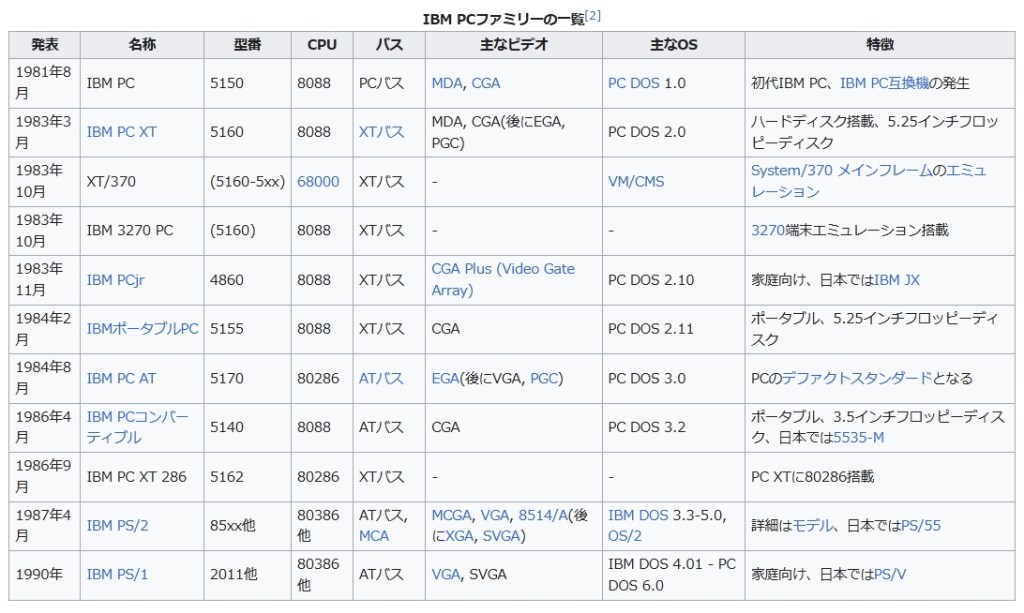 1981年8月 IBM PC 5150 8088 PCバス MDA, CGA PC DOS 1.0 初代IBM PC、IBM PC互換機の発生 1983年3月 IBM PC XT 5160 8088 XTバス MDA, CGA(後にEGA, PGC) PC DOS 2.0 ハードディスク搭載、5.25インチフロッピーディスク 1983年10月 XT/370 (5160-5xx) 68000 XTバス – VM/CMS System/370 メインフレームのエミュレーション 1983年10月 IBM 3270 PC (5160) 8088 XTバス – – 3270端末エミュレーション搭載 1983年11月 IBM PCjr 4860 8088 XTバス CGA Plus (Video Gate Array) PC DOS 2.10 家庭向け、日本ではIBM JX 1984年2月 IBMポータブルPC 5155 8088 XTバス CGA PC DOS 2.11 ポータブル、5.25インチフロッピーディスク 1984年8月 IBM PC AT 5170 80286 ATバス EGA(後にVGA, PGC) PC DOS 3.0 PCのデファクトスタンダードとなる 1986年4月 IBM PCコンバーティブル 5140 8088 ATバス CGA PC DOS 3.2 ポータブル、3.5インチフロッピーディスク、日本では5535-M 1986年9月 IBM PC XT 286 5162 80286 XTバス – – PC XTに80286搭載 1987年4月 IBM PS/2 85xx他 80386他 ATバス, MCA MCGA, VGA, 8514/A(後にXGA, SVGA) IBM DOS 3.3-5.0, OS/2 詳細はモデル、日本ではPS/55 1990年 IBM PS/1 2011他 80386他 ATバス VGA, SVGA IBM DOS 4.01 – PC DOS 6.0 家庭向け、日本ではPS/V 影響