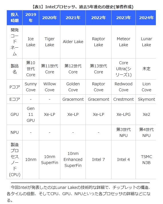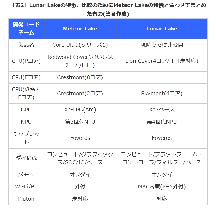 今回Intelが明らかにした前世代(Core Ultra)と比較したLunar Lakeの改良点をハイレベルでまとめると、以下の表の通りになる。それぞれのポイントで詳しく解説していく。 【表2】Lunar Lakeの特徴、比較のためにMeteor Lakeの特徴と合わせてまとめたもの(筆者作成)開発コードネーム Meteor Lake Lunar Lake
