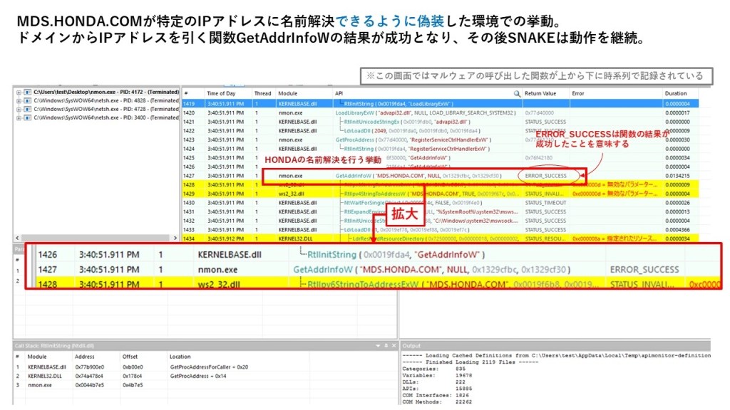 特定のIPアドレスに名前解決ができる環境で動かすとEKANSは動作を継続する (出所:三井物産セキュアディレクション) 吉川氏によれば上記IPアドレスはホンダの米法人のものだという。「情報流出していたのかハッキングしたのかは分からないが、攻撃者はあらかじめホンダの社内ネットワーク情報を収集してから(マルウエアを)開発したと推測できる」(吉川氏)。 』 『第2の特徴 は、通信妨害にWindowsが備える正規のファイアウオールを使う点だ。今回の検体は名前解決できる環境にいると分かると、ファイルの暗号化に先立ってネットワーク通信を妨害する。これにより端末内部の多くのソフトが通信できなくなる。