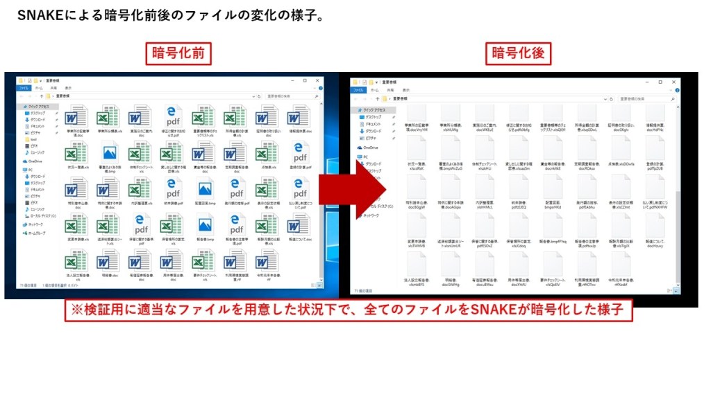 検証用に用意したファイルをEKANSが暗号化した (出所:三井物産セキュアディレクション) 今回の検体が起動したコンピューターがドメインコントローラーの場合はファイルを暗号化せず、パブリックデスクトップなどに脅迫文のみを送る。脅迫文には「企業ネットワークを突破してファイルを暗号化した。復旧にはファイル復号ツールを購入する必要がある」旨のメッセージと連絡先メールアドレスを記載する。