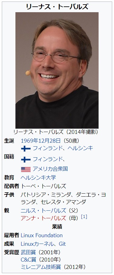 『リーナス・ベネディクト・トーバルズ(Linus Benedict Torvalds、1969年12月28日 – 、Sv-Linus Torvalds.ogg [ˈliːnɵs ˈtuːrvalds][ヘルプ/ファイル])はフィンランド、ヘルシンキ出身のアメリカ合衆国のプログラマ。Linuxカーネルを開発し、1991年に一般に公開した。その後も、公式のLinuxカーネルの最終的な調整役(もしくは「優しい終身の独裁者」)を務める。