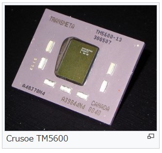 Crusoeを採用した主なパソコン NEC – LaVieMX、LavieZ 駆動時間を延ばすために取り外し型バッテリのほかにLCD(反射型または半透過型)の裏にも取り外し不可のバッテリを実装していた。 富士通 – FMV-BIBLO LOOX ソニー – VAIO PCG-C1VJシリーズ、PCG-GT3、PCG-U1等 カシオ – CASSIOPEIA FIVA(MPC-205/206/206VL/216XL/225/701) シャープ – Mebiusノート PC-SX1-H1 PC-MM1シリーズ 東芝 – Libretto L1、L2、L3、L5 日立製作所 – FLORA 220TX、210W NL3 (企業向け)210W NL3はシャープのPC-MM1シリーズとほぼ同一の設計だが、BIOSや、パーツの実装などが一部異なる。 OQO – アメリカで超小型PCを開発、発売 このほか、IBMもCrusoeを搭載したノートパソコン(ThinkPad)を試作、展示したことがあったが、目標とした連続駆動時間を実現できず、開発は中止された[1]。』