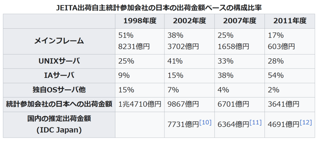 [脚注の使い方] ^ “メインフレームとは – IT用語辞典”. IT用語辞典 e-Words. 2021年9月10日閲覧。 ^ “メインフレーム | ビジネス用語集”. エリートネットワーク – 正社員専門の転職エージェント. 2021年9月10日閲覧。 ^ “汎用コンピュータとは 「汎用機, 大型汎用コンピュータ」 (mainframe) はんようコンピュータ: – IT用語辞典バイナリ”. http://www.sophia-it.com . 2021年9月10日閲覧。 ^ IBM Mainframes – IBM Archives ^ HPCの歩み50年(第23回) ^ 国産コンピュータメーカがIBMと基本特許契約 – コンピュータ博物館 ^ a b JEITA. “コンピュータおよび関連装置等出荷統計”. 2009年11月10日閲覧。 ^ 平成23年度(平成23年4月〜平成24年3月)わが国におけるサーバ・ワークステーションの出荷実績2 ^ サーバ平成23年度価格帯別 ^ 2002年国内サーバー市場は前年比11.1%のマイナス成長 〜IAサーバーも前年の2桁成長から一転マイナスへ ^ 2007年のサーバ出荷金額は6.0%減の6364億円、出荷台数は5年ぶりの減少 ^ 【IDC Japan調査】2011年国内サーバ市場、出荷額、出荷台数ともに前年を上回る ^ IBM新社長与那嶺氏、z Systemsを語る「メインフレームはレガシーではない」 – Enterprise Zine ^ ラスボス「メインフレーム」もクラウドへ、AWSやGoogleが移行支援に本腰 ^ AWSがメインフレーム移行でIBMに宣戦布告、世界5000社を巡るバトル ^ 日立がメインフレーム製造から完全撤退、開発はOSだけ – 日経XTECH ^ a b デジタル化時代の基幹システムを支える新メインフレーム エンタープライズサーバ「AP10000」を販売開始 – 日立製作所 ^ 富士通がメインフレーム製造・販売から2030年度に完全撤退へ、66年の歴史に幕 ^ NEC、DX推進に貢献するメインフレームACOS-4新モデル「i-PX AKATSUKI/A100シリーズ」を発売 ~性能・機能を大幅に向上した独自プロセッサ「NOAH-7」搭載~ ^ NEC、現行機比、CPU性能を3.5倍に向上・消費電力を60%削減するメインフレーム「ACOSシリーズ」の大型機「i-PX9800/A100」を発売 – NEC ^ 日立が北米の事業方針を大転換、MFの新規営業を停止nikkei BPnet2000年3月23日 2013年6月29日閲覧 ^ 日立と米IBM、サーバ/メインフレーム分野での包括的な提携を開始 マイナビニュース2001年3月13日 2013年6月29日閲覧 ^ 日経ソリューションビジネス(2005/10/30号) ^ 日立がメインフレーム製造から完全撤退、開発はOSだけ – 日経XTECH ^ メインフレームのハードウェアに関するIBMとの協業を強化 – 日立製作所 ^ 日立製作所の新しいメインフレーム環境にハードウェア技術を提供 – 日本IBM ^ a b c 【富士通】 UTS/M,UXP/M,UXP/V コンピュータ博物館 ^ IBM、メインフレーム代替サーバの開発企業を提訴 ^ IBM,メインフレーム技術のPlatform Solutionsを買収 ^ 欧州でIBMに独禁法訴訟、メインフレームめぐり 関連項目 端末(利用者端末、コンソール) 大型計算機センター 外部リンク