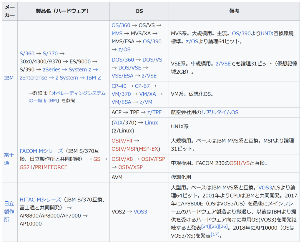 →詳細は「オペレーティングシステムの一覧 § IBM」を参照 OS/360 → OS/VS → MVS → MVS/XA → MVS/ESA → OS/390 → z/OS MVS系。大規模用。主流。OS/390よりUNIX互換環境標準。z/OSより論理64ビット。