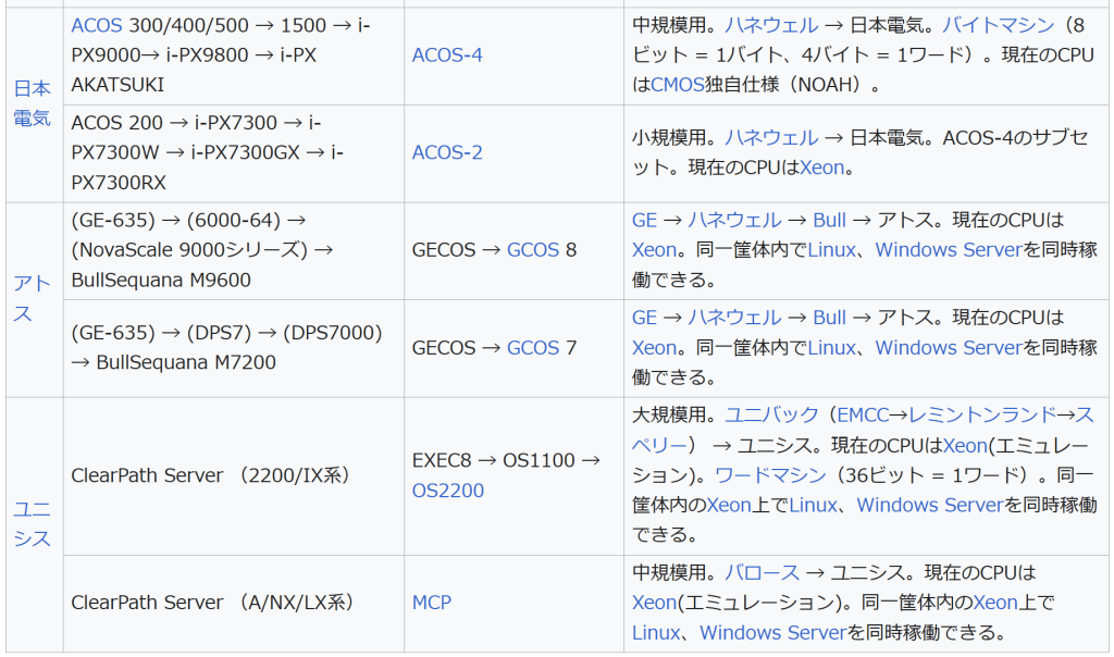 日本電気 ACOS 300/400/500 → 1500 → i-PX9000→ i-PX9800 → i-PX AKATSUKI ACOS-4 中規模用。ハネウェル → 日本電気。バイトマシン(8ビット = 1バイト、4バイト = 1ワード)。現在のCPUはCMOS独自仕様(NOAH)。
