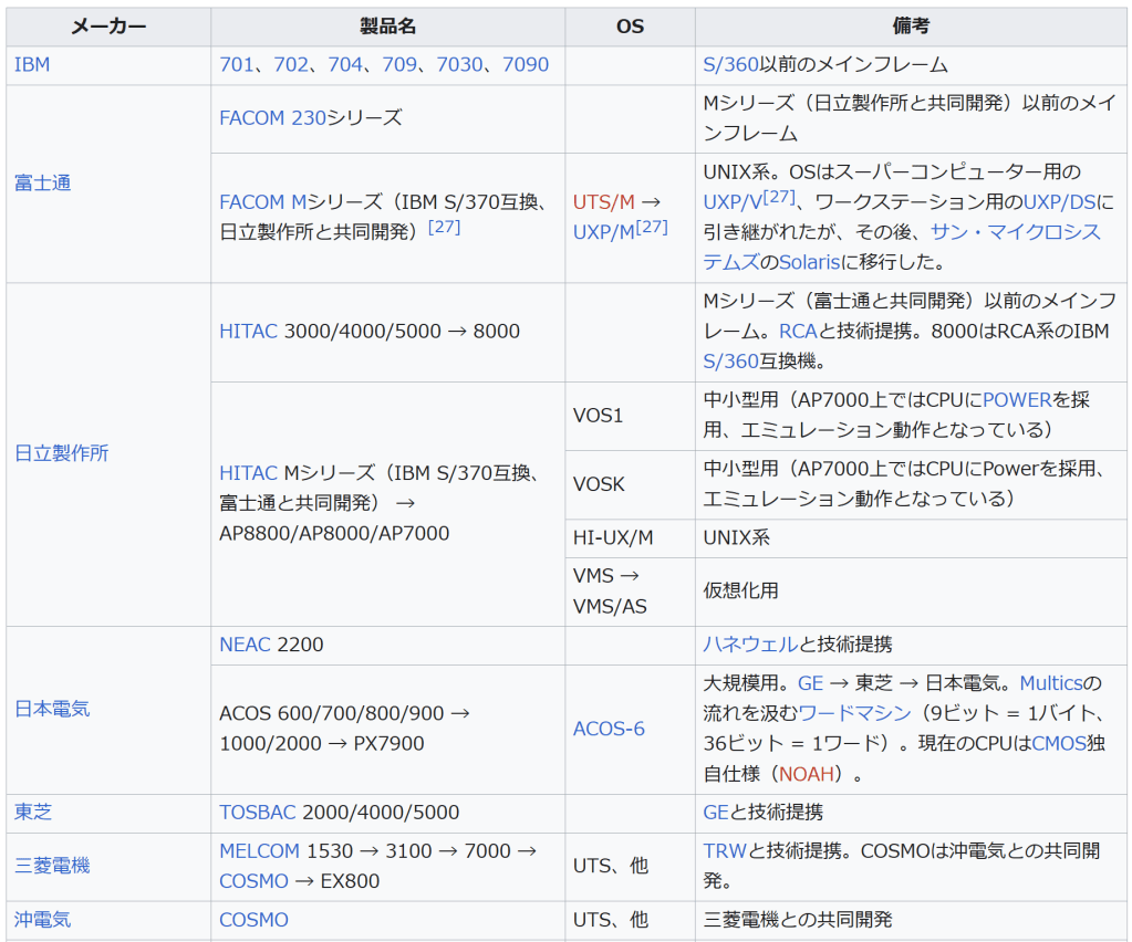 現存する各社の主なメインフレームとその系譜は以下の通りである。