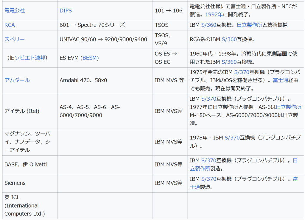 BASF、伊 Olivetti IBM MVS等 IBM S/370互換機(プラグコンパチブル)。日立製作所製造。 Siemens IBM MVS等 IBM S/370互換機(プラグコンパチブル)。富士通製造。