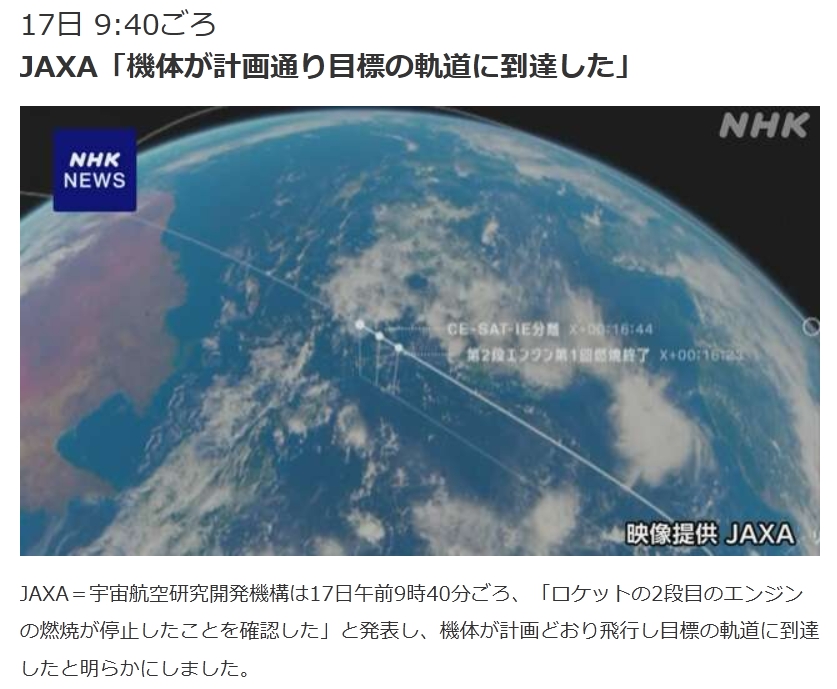 JAXA=宇宙航空研究開発機構は17日午前9時40分ごろ、「ロケットの2段目のエンジンの燃焼が停止したことを確認した」と発表し、機体が計画どおり飛行し目標の軌道に到達したと明らかにしました。