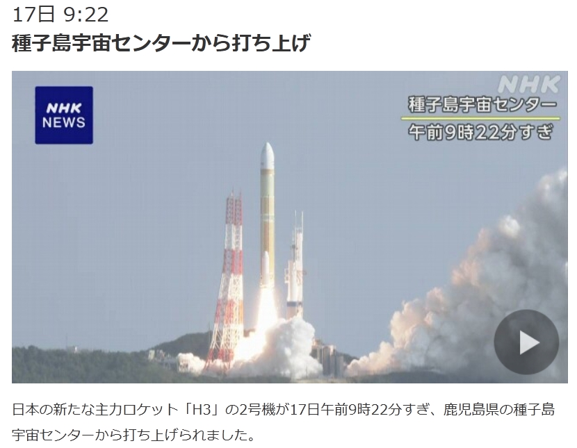 日本の新たな主力ロケット「H3」の2号機が17日午前9時22分すぎ、鹿児島県の種子島宇宙センターから打ち上げられました。