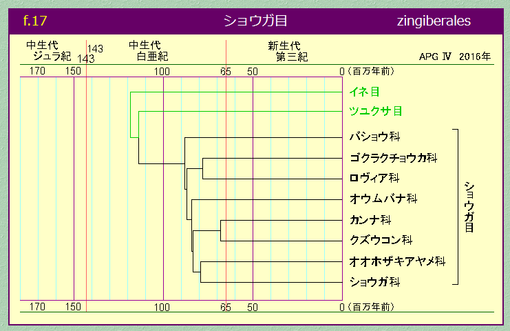 単子葉植物の中ではもっともおそく分岐しています。すなわちもっとも新しい種族といえるでしょう。 茎は地下茎で地上に出る茎のように見えるものは葉鞘が幾重にも巻かれたもので偽茎とよばれています。 葉脈は羽状で葉柄と主脈に空洞があります。 花は左右相称で子房下位です。 f.17 ショウガ目 zingiberales 』
