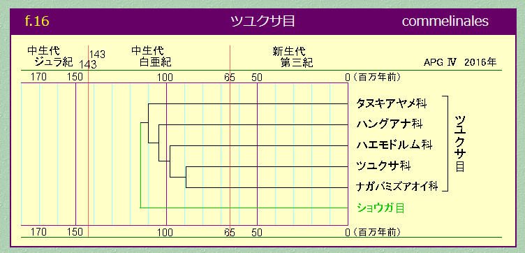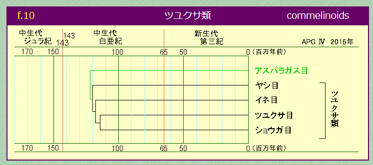 ツユクサ類にはヤシ目、ツユクサ目、イネ目、ショウガ目があります。 f.10 ツユクサ類 commelinoids ヤシ目 arecales アレカレス