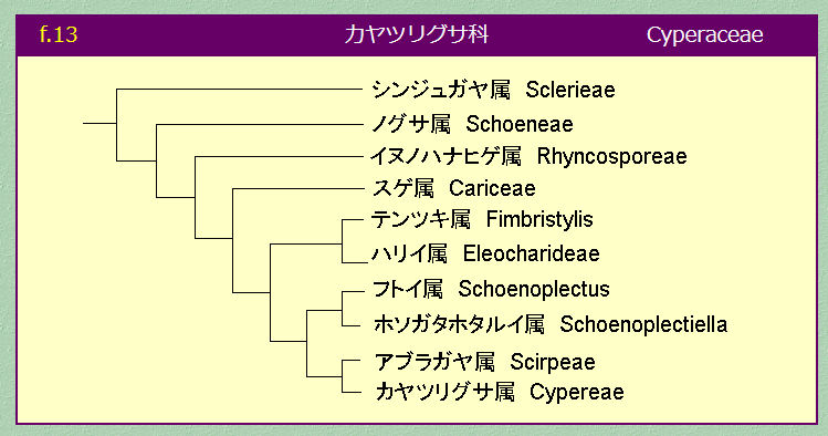 イネ科と異なり人類に役立つものはあまりありません。 f.13 カヤツリグサ科 Cyperaceae 単子葉植物 究極の進化 イネ科 Poaceae ポアケアエ