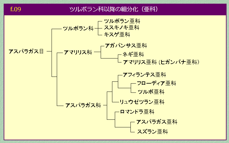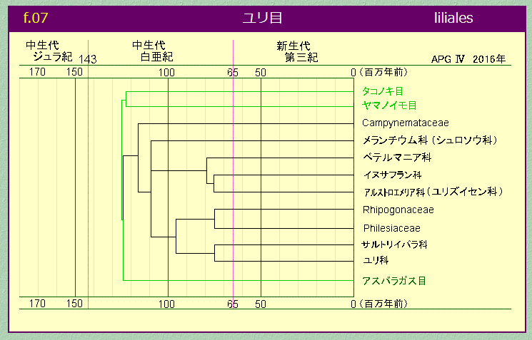 これ以外はほとんどアスパラガス目に移行されました。 f.07 ユリ目 liliales 大きくなったアスパラガス目 アスパラガス目 asparagales アスパラガレス