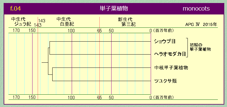 初期の単子葉植物は、ショウブ目とヘラオモダカ目です。