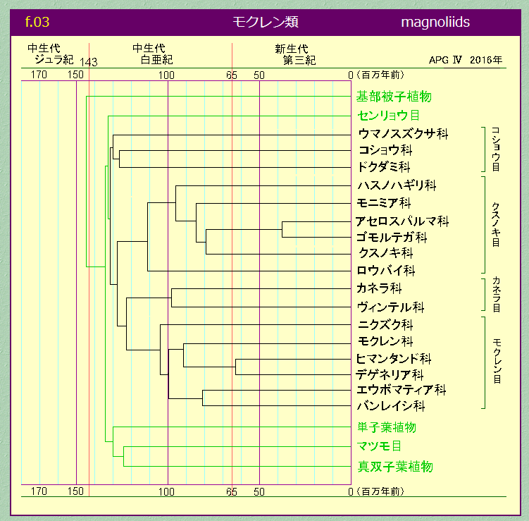 basal angiosperms 双子葉植物と単子葉植物の共通の祖先を基部被子植物、または原始的被子植物と呼ぶことにします。 アムボレラ目、スイレン目、アウストロバイレヤ目3目があります。 センリョウ目は基部被子植物から派生したが、基部被子植物にもモクレン類にも属さない独立した系統です。 f.02 基部被子植物 basal angiosperms モクレン類 magnoliids マグノリイヅ 基部被子植物の次に分岐したグループです。 古い種族ですが、アムボレラなどと比較すると、後述の真双子葉植物により近いといえます。 しかし、それでもまだシュートの形態を強く残しています。 すなわち茎にあたる花軸上に葉にあたる花被、おしべ、 めしべが、下から上に向かってらせん状についていることです。 主なものにコショウ目、クスノキ目、カネラ目、モクレン目があります。 原始的被子植物とモクレン類をあわせても、被子植物全体の、わずか3%しかありません。 f.03 モクレン類 magnoliids 単子葉植物 monocots モノコッツ