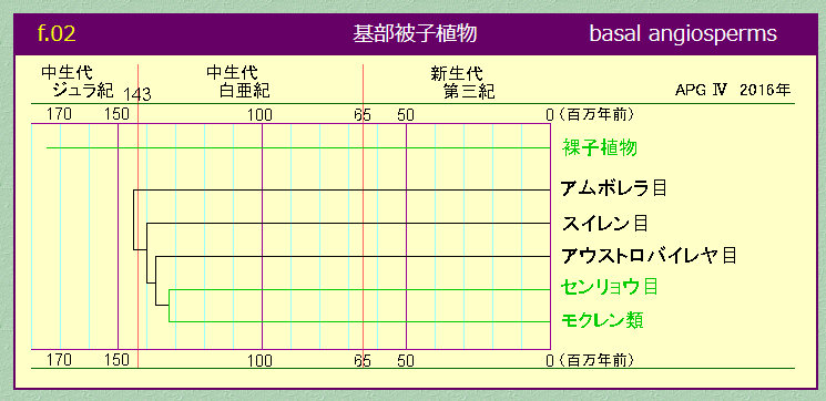花では、種子になる部分を胚珠といいますが、胚珠を包んでいるのが子房です。 裸子植物には子房がなく、被子植物には子房があります。 子房は胚珠を守るものだから、被子植物が、裸子植物から進化しただろうということは、だれにでも理解できます。 被子植物とは、子房をもっている植物のことなのです。 f.01 被子植物 全体 angiosperms 基部被子植物 basal angiosperms ベイサル アンジオスパームス (Neitherr Monocot nor Dicot)