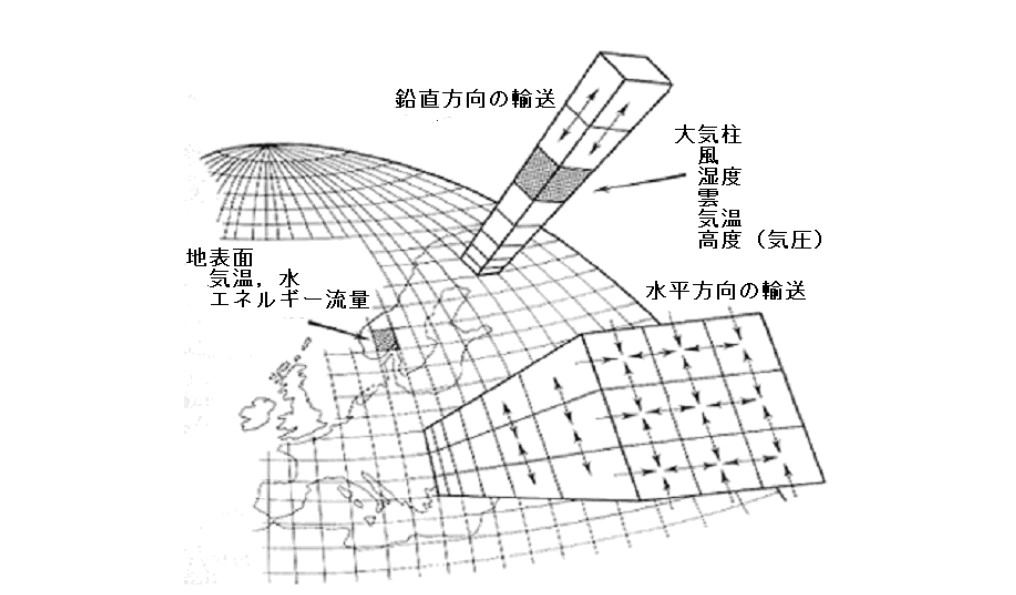 ※ 地表面を、小さい区画にわけて「メッシュ」と捉え、そこにおける気温、水温から「エネルギー流量」を計算する…。