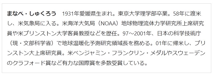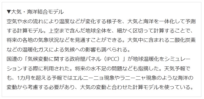 その後、真鍋淑郎は実質的にGFDLでの大循環モデルの開発を主導し、二酸化炭素を倍増させた大循環モデルや、大気と海洋と結合させた大循環モデルを開発した。』