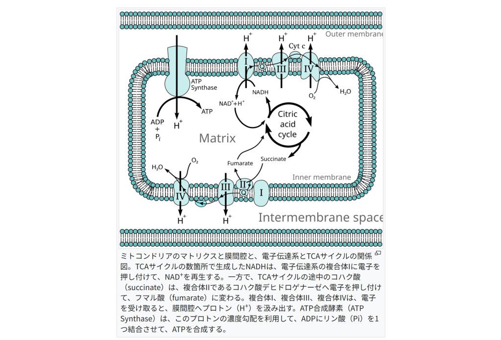 ミトコンドリアのマトリクスと膜間腔と、電子伝達系とTCAサイクルの関係図。
