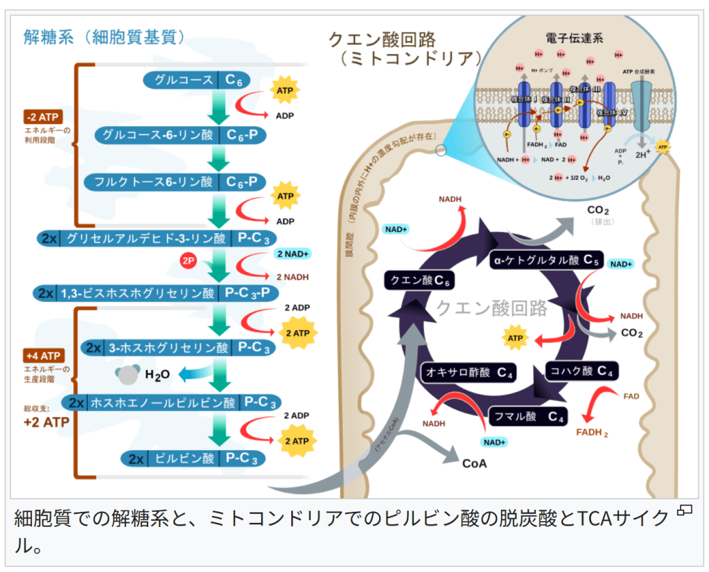 ^ ミトコンドリアのシャトル系などの関係で、多少の変動が出る。なお、この1分子のグルコースから、約38分子のATPという比率は、代謝系に阻害が行われておらず、かつ、サーモジェニン(英語版)などが動いていない場合の話である。