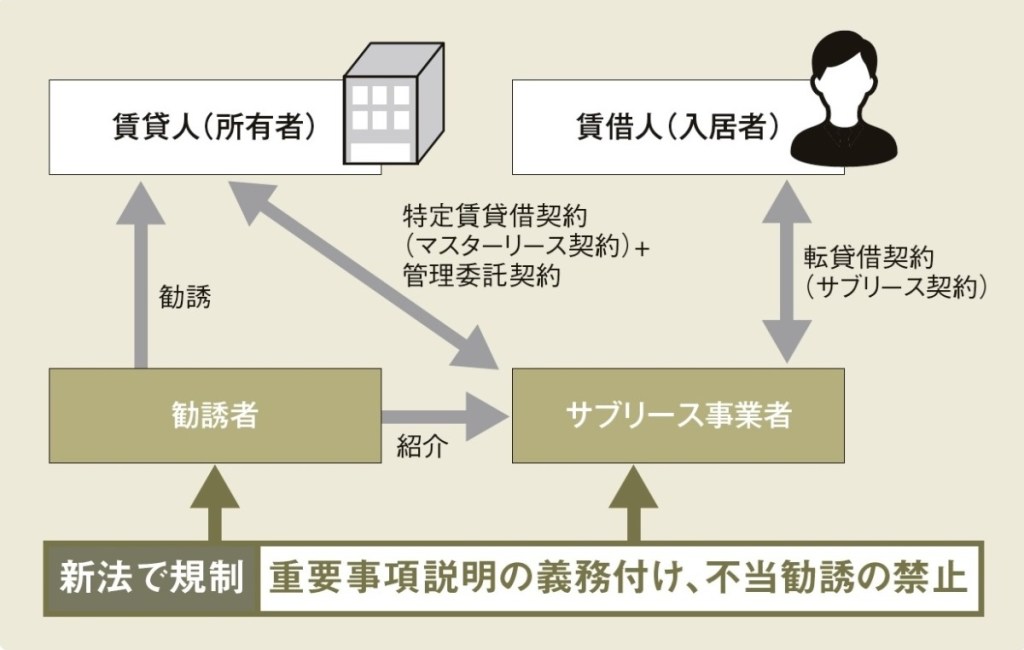重要事項説明では、家賃や契約期間などを記した書面の交付を義務付ける。これらの規制は管理委託事業を担うサブリース事業者に限らず、勧誘のみを行う者にも適用する。