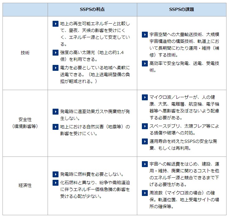 地球上で太陽光発電をした場合、夜間や曇りの場合には発電できないため、平均で太陽光パネルの稼働率は15%とも言われる。夜のない宇宙空間では24時間発電できる。送電線の代わりにビームで送れば地球でエネルギーを受けたり、月面の裏側や他の星に電気を送ったりといったことも理論上可能になる。