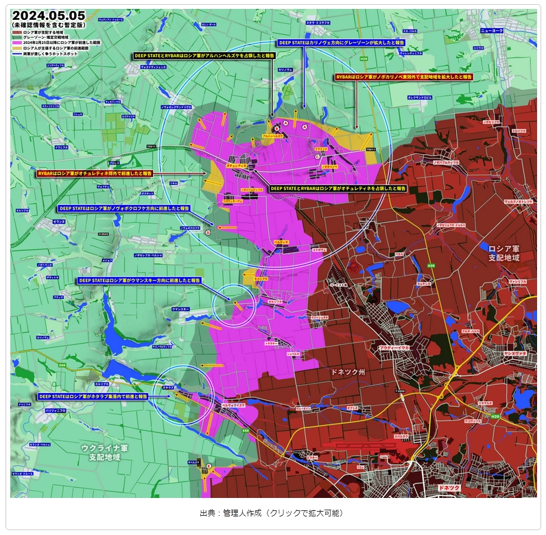 さらにDEEP STATEはアウディーイウカ方面についても「ロシア軍がオチュレティネを占領した」「ロシア軍がアルハンヘルズケを占領した」「ロシア軍がノヴォポクロフケ方向に前進した」「ロシア軍がウマンスキー方向に前進した」と報告。