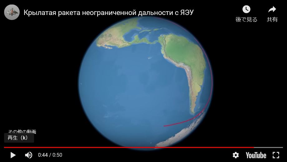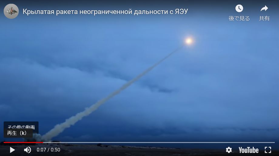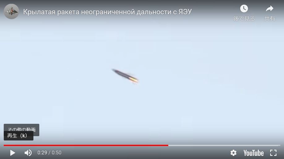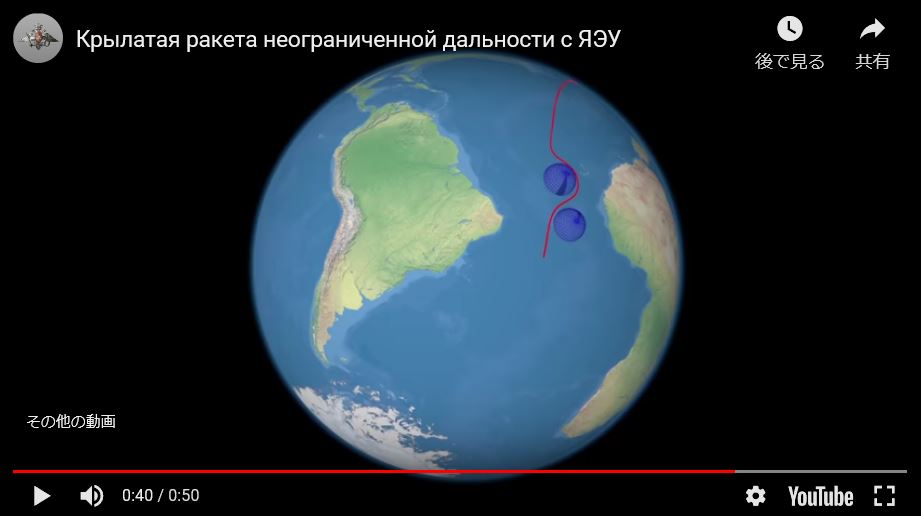 『「我々は新しいタイプの戦略兵器を開発し始めた。これは、目標に向かって飛行する際に弾道軌道を通らないから、MD(ミサイル防衛システム)は役に立たず、意味を失う」。このようにプーチン大統領は、ロシア国内と世界に新型巡航ミサイルをデモンストレーションしつつ説明した。このミサイルは原子力エンジンを搭載しており、地球を何周でもできる。』