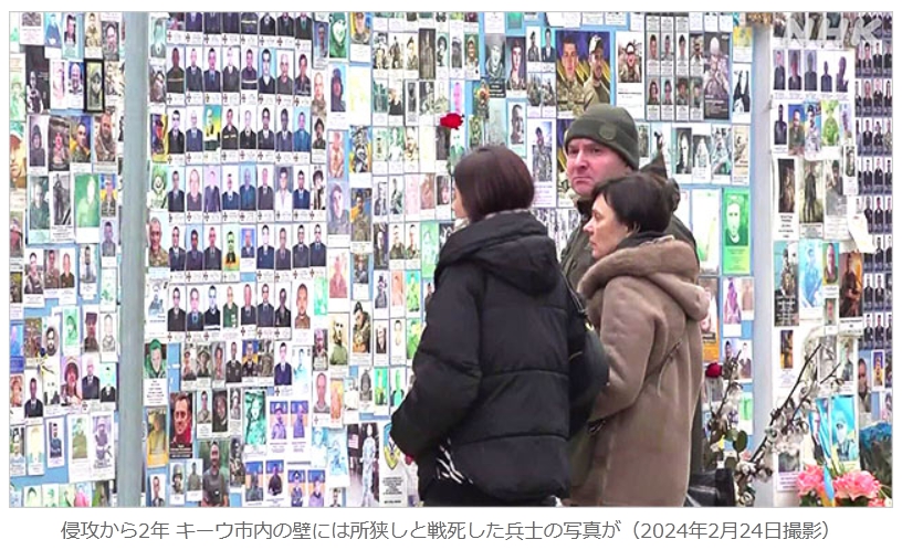 侵攻から2年 キーウ市内の壁には所狭しと戦死した兵士の写真が(2024年2月24日撮影)