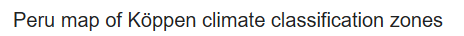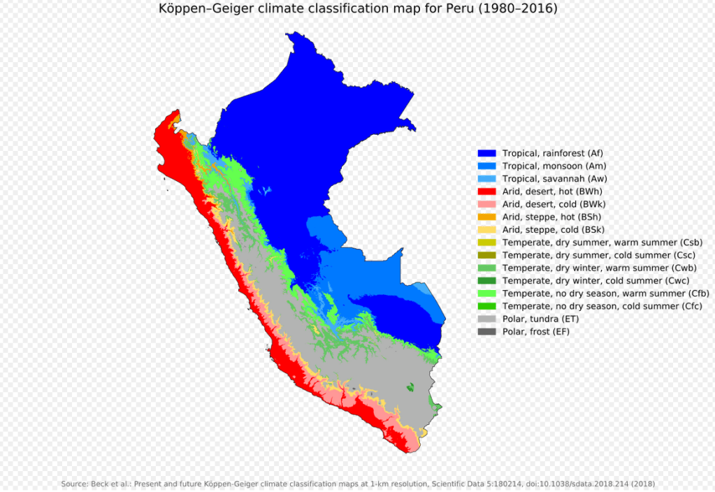 ケッペン気候分類ゾーンのペルー地図熱帯の緯度、山脈、地形の変化、および 2 つの海流 (フンボルトとエルニーニョ) の組み合わせにより、ペルーは多種多様な気候になっています。ペルーは熱帯気候で、雨季と乾季があります。[13]