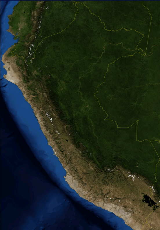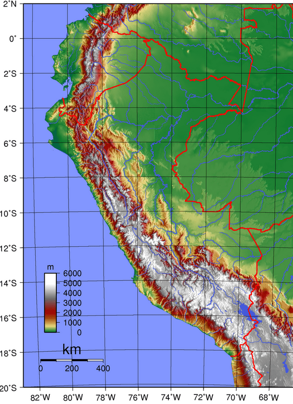 地形:西海岸の平野(コスタ)、中央の高くて険しいアンデス (シエラ)、アマゾン盆地の東の低地のジャングル (セルバ)。