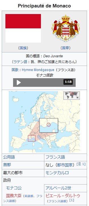モナコhttps://ja.wikipedia.org/wiki/%E3%83%A2%E3%83%8A%E3%82%B3