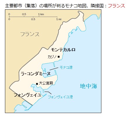 モナコの地図 モンテカルロ全景 詳細は「モナコの地理(フランス語版)」を参照 [icon] この節の加筆が望まれています。