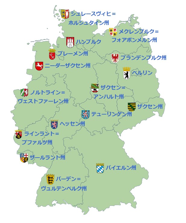 メクレンブルク州 シュヴェリーン 23.402 km² Flagge Großherzogtümer Mecklenburg.svg Siegel Land Mecklenburg (DDR).svg 1947年憲法(ドイツ語版)[7] 1945年から1947年までの名称は「メクレンブルク=フォアポンメルン州」[8]