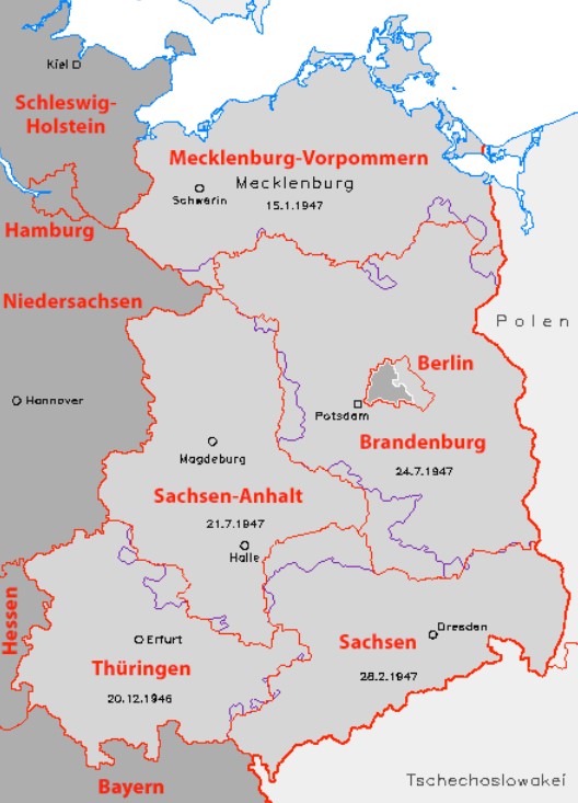 これを受けて、ドイツ東部を占領したソビエト連邦軍によって設置された在独ソ連軍政府は1945年7月、連合国軍の分割占領下にあったベルリンを除く各地区に独自の地方政府を置き、1949年のドイツ民主共和国成立によって、連邦制を採用した東ドイツの州(Länder)となった。