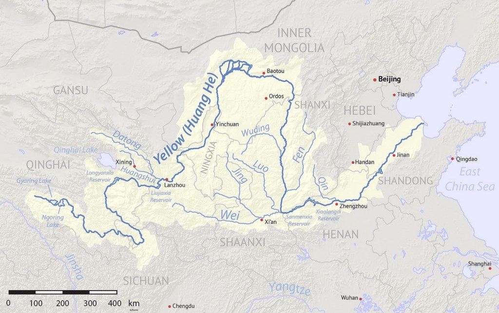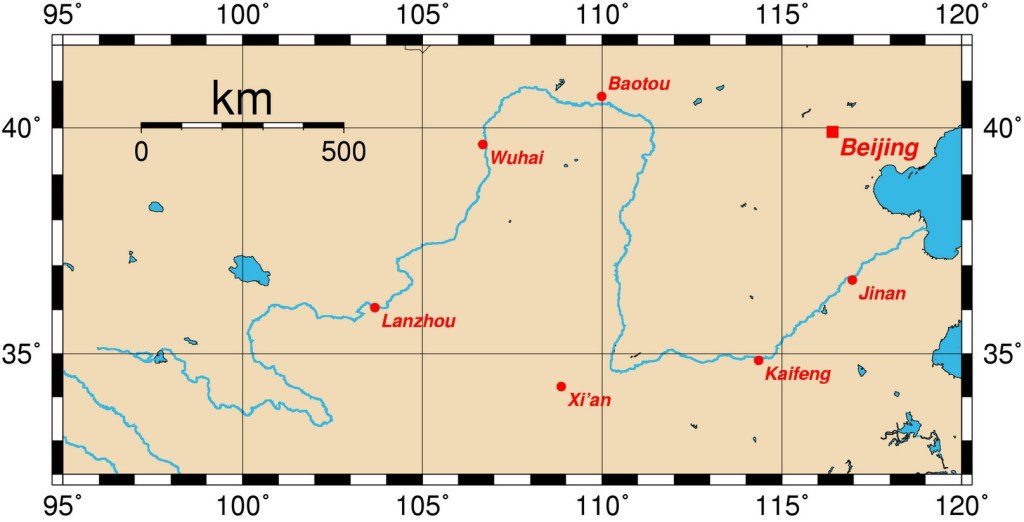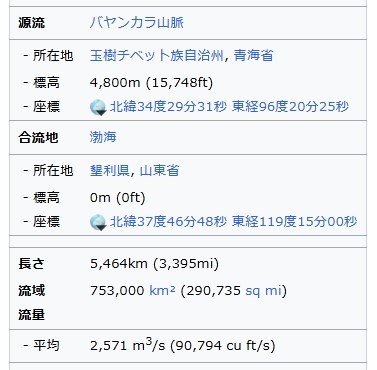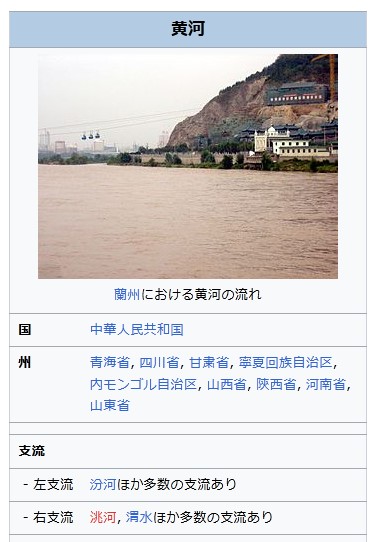 現在の中国の省である河北省・河南省は、それぞれ主要地域が黄河の北と南に位置していることからつけられた名前である。ただし、河北省は全域が黄河の北に位置するのに対し、河南省の北部の一部分は黄河の北に位置する。また、河南省は省内を黄河が流れるが、河北省内には黄河の本流だけでなく、黄河の流域すら存在しない。また、甘粛省の西部、武威から敦煌にいたる900キロの細長いオアシス都市群地域を河西回廊と呼ぶが、これは蘭州を流れる黄河の西に位置することにちなむ。』
