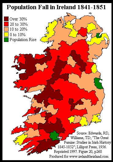1841年の国勢調査によると、人口はわずか800万人で、そのうち3分の2は農業に頼って生き延びていたが、給料をもらって働くことはほとんどなかった。自分の土地と引き換えに地主のために働かなければならず、一家のために十分な食料を植えることができた。この制度は、アイルランド人にモノカルチャーの実践を強制し、ジャガイモだけが一家全員を十分に支えるものとなった。土地の権利は、19世紀初頭のアイルランドでの生死の差となっていた[16]。