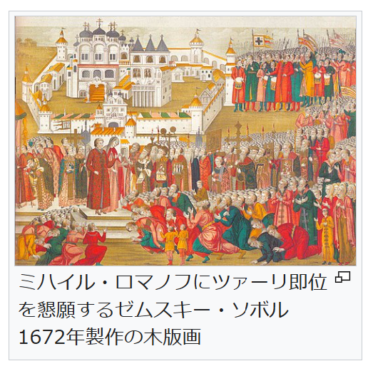 ミハイル・ロマノフにツァーリ即位を懇願するゼムスキー・ソボル 1672年製作の木版画 1584年にイヴァン4世が死去して、フョードル1世(在位1584年 – 1598年)が即位するが、彼が跡継ぎを残さずに死去したためリューリク朝は断絶した。全国会議(ゼムスキー・ソボル)の支持を受けた外戚のボリス・ゴドゥノフが即位するが、死去したと伝えられていたイヴァン4世の子ドミトリーを名乗る男が現れ(偽ドミトリー1世)、ポーランド軍とともにロシアに侵攻した。1605年にボリス・ゴドゥノフは事態を収拾できずに死去し、偽ドミトリー1世がモスクワを占拠してツァーリに即位した。偽ドミトリー1世は1年程で殺害されるが、偽ドミトリー2世、3世が現れて内戦状態が続き、1610年にはロシア・ポーランド戦争を起こして介入したポーランド軍にモスクワを占領される事態に陥った(動乱時代)。この時期にロシアはスモレンスクを含む西部国境地帯の一部をポーランドに、バルト海沿岸のノヴゴロドをスウェーデンに奪われている[11]。