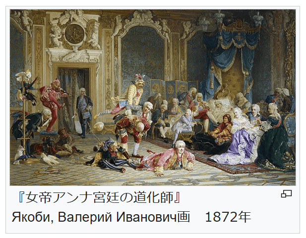 『女帝アンナ宮廷の道化師』 Якоби, Валерий Иванович画 1872年 1725年1月28日にピョートル1世は後継者を定めずに死去した。近衛隊の支持を受けた皇后エカチェリーナがロシア史上初の女帝として即位した(エカチェリーナ1世 在位1725年 – 1727年)[44]。政治の実権は最高枢密院を牛耳るメーンシコフ将軍が掌握したが[n 4]、エカチェリーナ1世は僅か2年の在位で死去する[45]。
