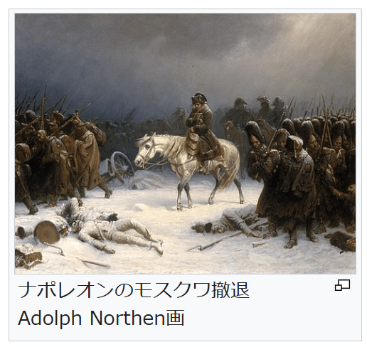 ナポレオンのモスクワ撤退 Adolph Northen画 大陸封鎖令の実施を巡ってロシアとフランスの対立が高まり、1812年6月にナポレオンは約60万人の大兵力を率いてロシアに侵攻した(第一次大祖国戦争)[93]。ロシア軍は決戦を避けて焦土作戦を行いつつ後退した[94]。9月にクトゥーゾフ将軍のロシア軍がボロジノの戦いでナポレオンの大陸軍と対戦するが、両軍とも甚大な犠牲を出して、ロシア軍は整然と後退した[95]。大陸軍はモスクワを占領するが、直後に大火(英語版)が起きて町は廃墟と化しており、アレクサンドル1世はナポレオンからの和平交渉に応じようとはしなかった[96]。ナポレオンはモスクワを放棄して撤退を開始するが、冬季の退却戦で大損害を出して大陸軍は壊滅状態となり、ロシア遠征はナポレオンにとって破滅的な大敗で終わった[97]。