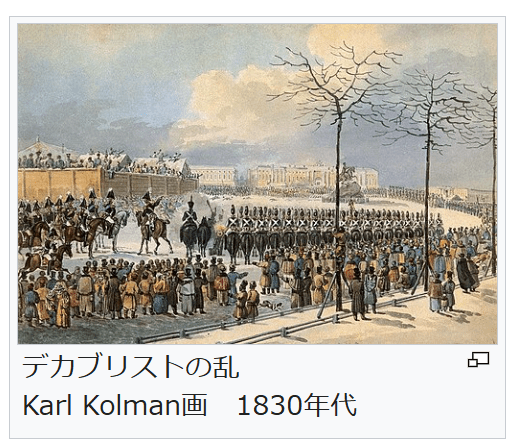 デカブリストの乱 Karl Kolman画 1830年代 →詳細は「ニコライ1世 (ロシア皇帝)」、「デカブリストの乱」、「東方問題」、および「クリミア戦争」を参照 1825年11月19日に急死したアレクサンドル1世には跡継ぎの男子がなく、皇位の継承に空白が生じ、弟のニコライ1世(在位1825年 – 1855年)が即位するまでに3週間を要した[n 7]。この混乱に乗じる形で12月14日に自由主義貴族や士官たちが決起した(デカブリストの乱)。専制政治の打倒と農奴制の廃止を主張する、この反乱の背景はナポレオン戦争に遡り、戦争の際に多数の教育を受けたロシア軍士官が従軍しており、西欧の自由主義思想に接した彼らは国内で秘密結社を組織して専制体制の祖国の改革を模索するようになった[103]。