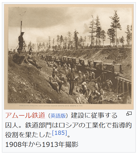 アムール鉄道(英語版)建設に従事する囚人。鉄道部門はロシアの工業化で指導的役割を果たした[185]。 1908年から1913年撮影 政治面での反動化が進められる一方で、この時代にロシア経済は目覚ましい発展を遂げた。1861年の農奴解放以降、混乱のために工業の発展は一時的に停滞したが[186]、1870年代に入ると繊維工業をはじめとする軽工業部門が成長した[187]。軽工業が成長した経緯とは、おおよそ次のようなものである。南北戦争のときロシアは戦地アメリカから綿花を輸入できなくなっていた。そこでロシアは綿花地帯の中央アジアへ南下しつつ、ロシア領アメリカ(アラスカ)をアメリカに売却し米国綿アップランド種(Gossypium hirsutum)を輸入するきっかけをつくった。1873年ヒヴァ・ハン国を保護国としたが、中央アジアの産する綿花はコッカリル(John Cockerill)製などの西洋式紡績機械に適合しなかった。1883年、アップランドを中央アジアへ移植することに成功、以後ブハラ・フェルガナ・サマルカンドでも移植を進めた。