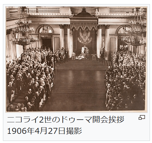 ニコライ2世のドゥーマ開会挨拶 1906年4月27日撮影 →詳細は「東部戦線 (第一次世界大戦)」、「ロシア革命」、および「2月革命 (1917年)」を参照 総選挙の実施を受けて、政党が結成され、主な政党には自由主義右派で政府寄りの10月17日同盟(十月党、オクチャブリスト)[228]と自由主義左派の立憲民主党(カデット)[229]がある。既に結成されていた社会主義者の社会革命党(エスエル)とボリシェヴィキは選挙のボイコットを決めており、1906年2月から3月に行われたドゥーマの総選挙では政府の選挙干渉にも関わらず立憲民主党が過半数を占めた[230][231]。一方、ニコライ2世と保守派は十月詔書での大幅な譲歩を後悔し始め、1906年4月にヴィッテを罷免した[232]。4月23日に国家基本法(憲法)が公布されたが、これは皇帝権が国会に優越する立憲君主制としては限定的なものであった[233]。