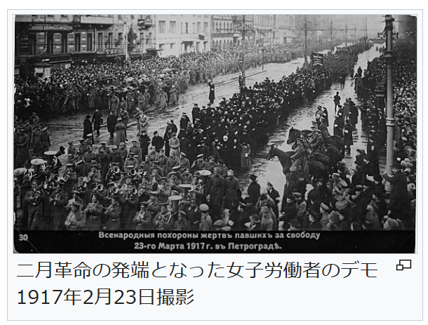 二月革命の発端となった女子労働者のデモ 1917年2月23日撮影 1915年中頃には戦争への意欲は失われていた。都市では食料と燃料が不足しており、インフレーションが激しくなり、各地で抗議デモやストが起こり、前線では兵士の脱走が頻発した[251]。ニコライ2世は自ら最高総司令官として戦争の指揮をとっており、内政については皇后アレクサンドラが摂政の役割を果たしていたが、皇后そして皇帝からも心酔されていた宗教家のラスプーチンの存在が醜聞化して広められ、皇帝の権威をひどく損なった[252]。ラスプーチンは1916年12月に貴族の一派によって暗殺されたが、失われた皇帝の権威を再生させることにはならなかった[253]。