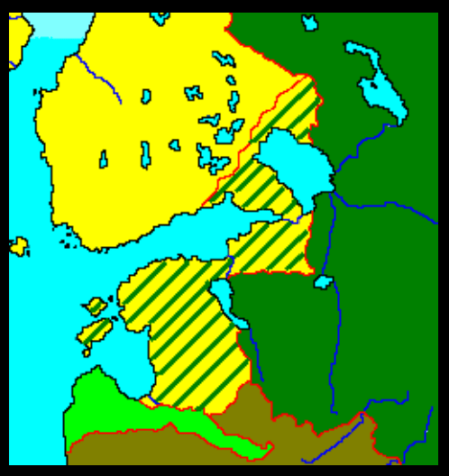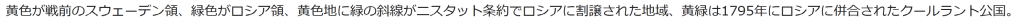 黄色が戦前のスウェーデン領、緑色がロシア領、黄色地に緑の斜線がニスタット条約でロシアに割譲された地域、黄緑は1795年にロシアに併合されたクールラント公国。 スウェーデンが支配していたリヴォニア(英語版)(南部エストニアと北部ラトビア)とエストランド(北部エストニア)は大北方戦争(1700年 – 1721年)でのスウェーデンの敗北により、ロシアに併合された。1721年に締結されたニスタット条約により、バルト・ドイツ系貴族には相当程度の自治権が留保され、在地における教育、治安そして司法に関する特権とルーテル教会の地位保証が与えられた。ポーランド・リトアニア領内にあったクールラント・ゼムガレン公国は、1795年の第三次ポーランド分割の際にロシアに併合されている。この地方にはリヴリャンド県(英語版)、エストランド県(英語版)、クルリャンド県(英語版)が置かれ、ラトビア人の居住地のうちラトレガはヴィテプスク県に組み込まれた。