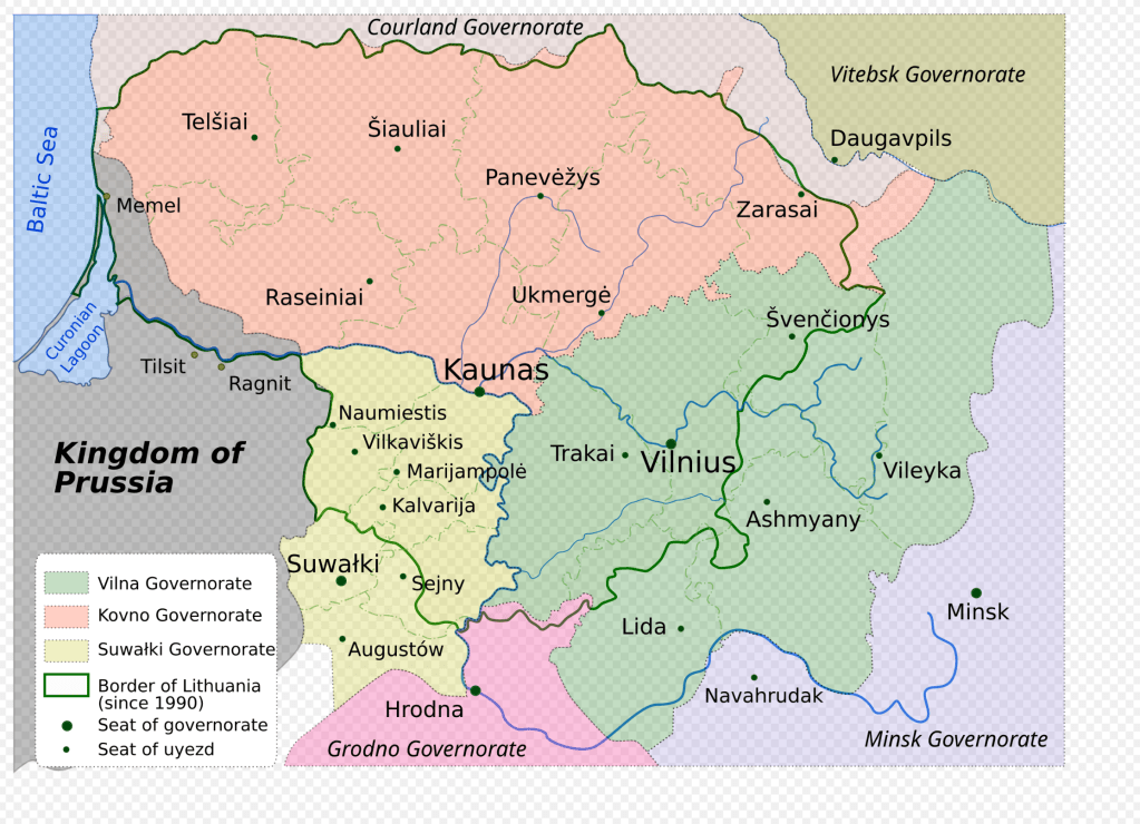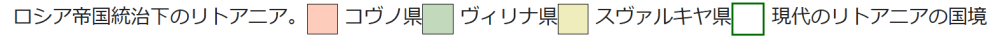 ロシア帝国統治下のリトアニア。 コヴノ県 ヴィリナ県 スヴァルキヤ県 現代のリトアニアの国境 現在のリトアニアに相当する地域は1795年の第三次ポーランド分割でロシア領となり、コヴノ県とヴィリナ県、スヴァルキヤ県が置かれた。1569年のポーランドとの合同(ルブリン合同)以来、リトアニア貴族や聖職者のポーランド化が進んでおり、彼らはポーランド人としての意識が強く、リトアニア語を話すのは農民だけの状態だった[325]。このポーランドへの帰属感がリトアニアの民族意識の形成を遅らせることになる[326]。