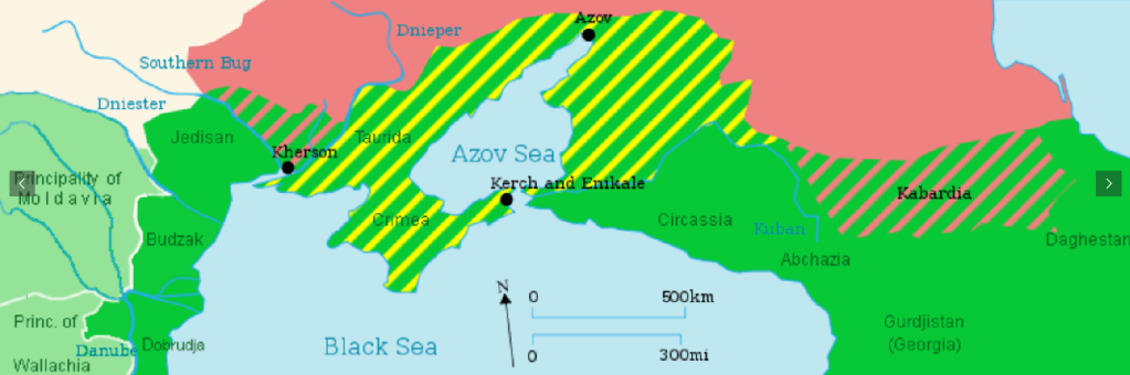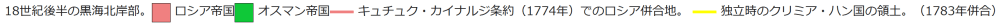 18世紀後半の黒海北岸部。 ロシア帝国 オスマン帝国 キュチュク・カイナルジ条約(1774年)でのロシア併合地。 独立時のクリミア・ハン国の領土。(1783年併合) ロシアとオスマン帝国の勢力圏は南方で接しており、帝政期を通じて戦争を繰り返している。17世紀まではオスマン帝国の国力がロシアを圧倒していたが、18世紀後半のエカチェリーナ2世(在位1762年 – 1796年)の時代にロシアが優勢になり、黒海沿岸、バルカン半島そしてカフカースのオスマン帝国やペルシアの領域を蚕食しつつ南下するようになる。