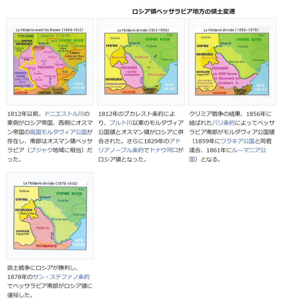 1812年のブカレスト条約により、プルト川以東のモルダヴィア公国領とオスマン領がロシアに併合された。さらに1829年のアドリアノープル条約でドナウ河口がロシア領となった。 1812年のブカレスト条約により、プルト川以東のモルダヴィア公国領とオスマン領がロシアに併合された。さらに1829年のアドリアノープル条約でドナウ河口がロシア領となった。