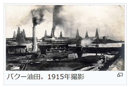 バクー油田。1915年撮影 ロシア帝国はグルジアのチフリス(トビリシ)にカフカス総督府(英語版)を置いてこの地域の支配の拠点となし、カフカース諸民族に対して徹底的な抑圧とロシア化政策を行った[365][370][371]。農奴解放は1866年にグルジア、1870年から1883年にかけてアゼルバイジャンとアルメニアで行われたが、ザカフカースの農民の多くが土地を失う結果となり、1917年の帝政崩壊時まで土地買戻金の支払いができずにいた[372]。この地域では1870年代以降、アゼルバイジャンのバクー油田が急速に発展し、20世紀はじめには世界の石油生産の半分を占めるまでになっている[370][373]。