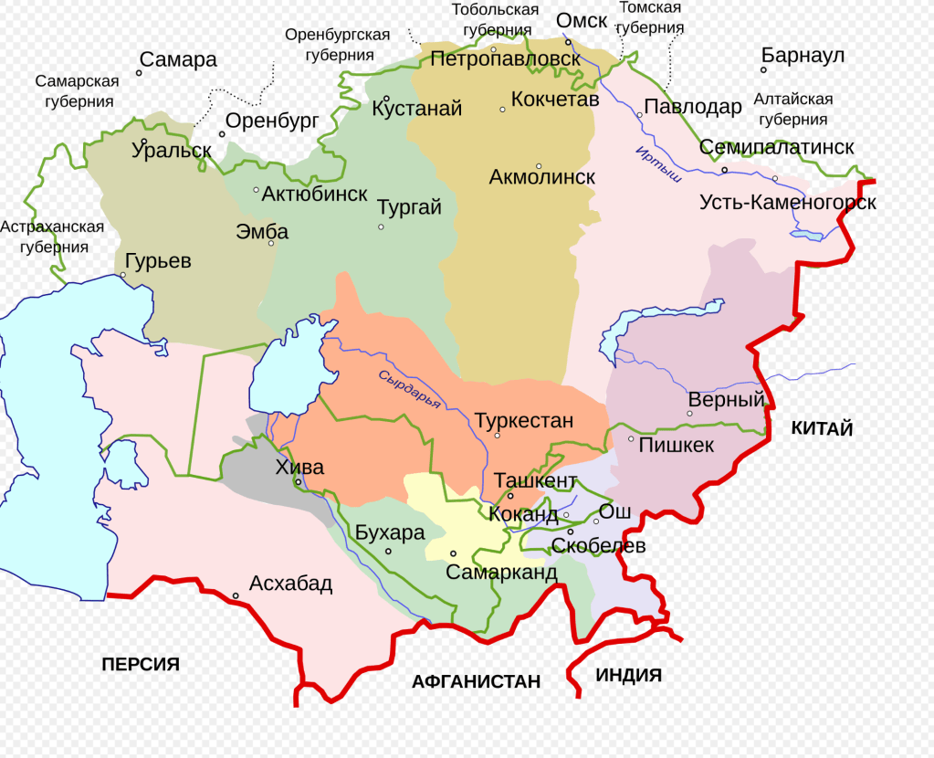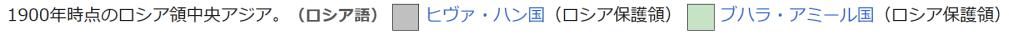1900年時点のロシア領中央アジア。(ロシア語) ヒヴァ・ハン国(ロシア保護領) ブハラ・アミール国(ロシア保護領) →詳細は「カザフ・ハン国」、「コーカンド・ハン国」、「ブハラ・ハン国」、「ヒヴァ・ハン国」、および「トルキスタン総督府」を参照 現在のカザフスタンの地域には大勢力を誇ったカザフ・ハン国が存在していたが、17世紀にセミレチエ地方の大ジュズ、中部の中ジュズそして西部の小ジュズに分裂して弱体化している。小ジュズは18世紀中頃にロシアに従属し、この地域にロシア人が進出するようになった[381]。19世紀前半に中・小ジュズはロシアの直接支配下に入り、1860年代には大ジュズが併合された[382]。カザフスタン東部にはステップ総督府が置かれた。ロシア人の入植が進められると土地を収奪されたカザフ人は不満を持ち反乱を繰り返すようになり、その最大のものが40年間も続いたケネサルの反乱(1837年 – 1877年)である[383]。ロシア政府がカザフ草原地帯の統治の手段としてタタール人官吏・商人を活用したことにより、支配者層に留まっていたイスラム信仰が民衆にまで広まった[384]。1890年代以降、ロシア人やウクライナ人の入植が増え、1911年時点でスラヴ系移民が人口の40%を占めるようになったと推定されている[385]。